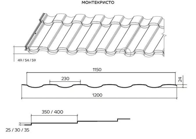 Симметричный профиль новой металлочерепицы МОНТЕКРИСТО придаст вашему дому элегантную сдержанность и строгость. Добиться ещё большей индивидуальности вы сможете, самостоятельно выбрав высоту ступеньки (25/30/35 мм) и её длину (350/400 мм). На массивных скатах будут гораздо уместнее смотреться более крупные фрагменты черепицы с максимальными размерами. Металлическая кровля с профилем МОНТЕКРИСТО имеет большую палитру цветов и полимерных покрытий, впечатляющие технические характеристики. Улучшенная форма бокового замка с двойной капиллярной канавкой обеспечивает герметичность соединений. Толщина стали не менее 0,5 мм и обрезка кромки по форме волны обеспечивают безупречную геометрию листов и маскируют горизонтальные соединения. Эта металлочерепица способна прослужить более 50 лет.